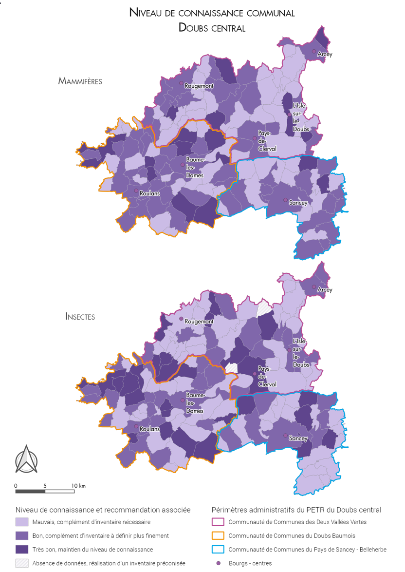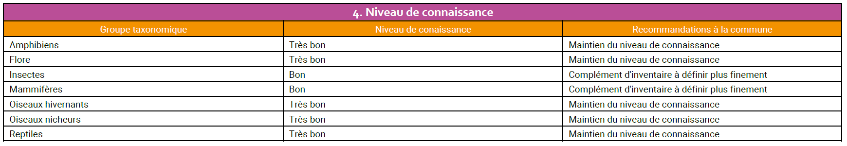 - Niveau de connaissance par groupe taxonomique : défini par le calcul d'un indice de connaissance composite (ratio du nombre d'espèces observé / nombre d'espèces théorique, et densité et répartition des observations sur les communes)