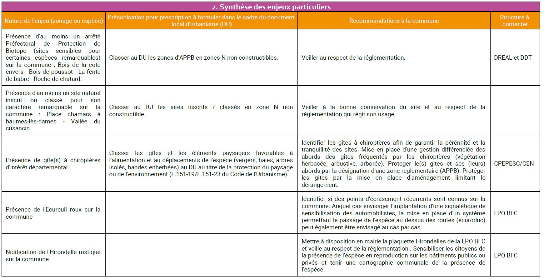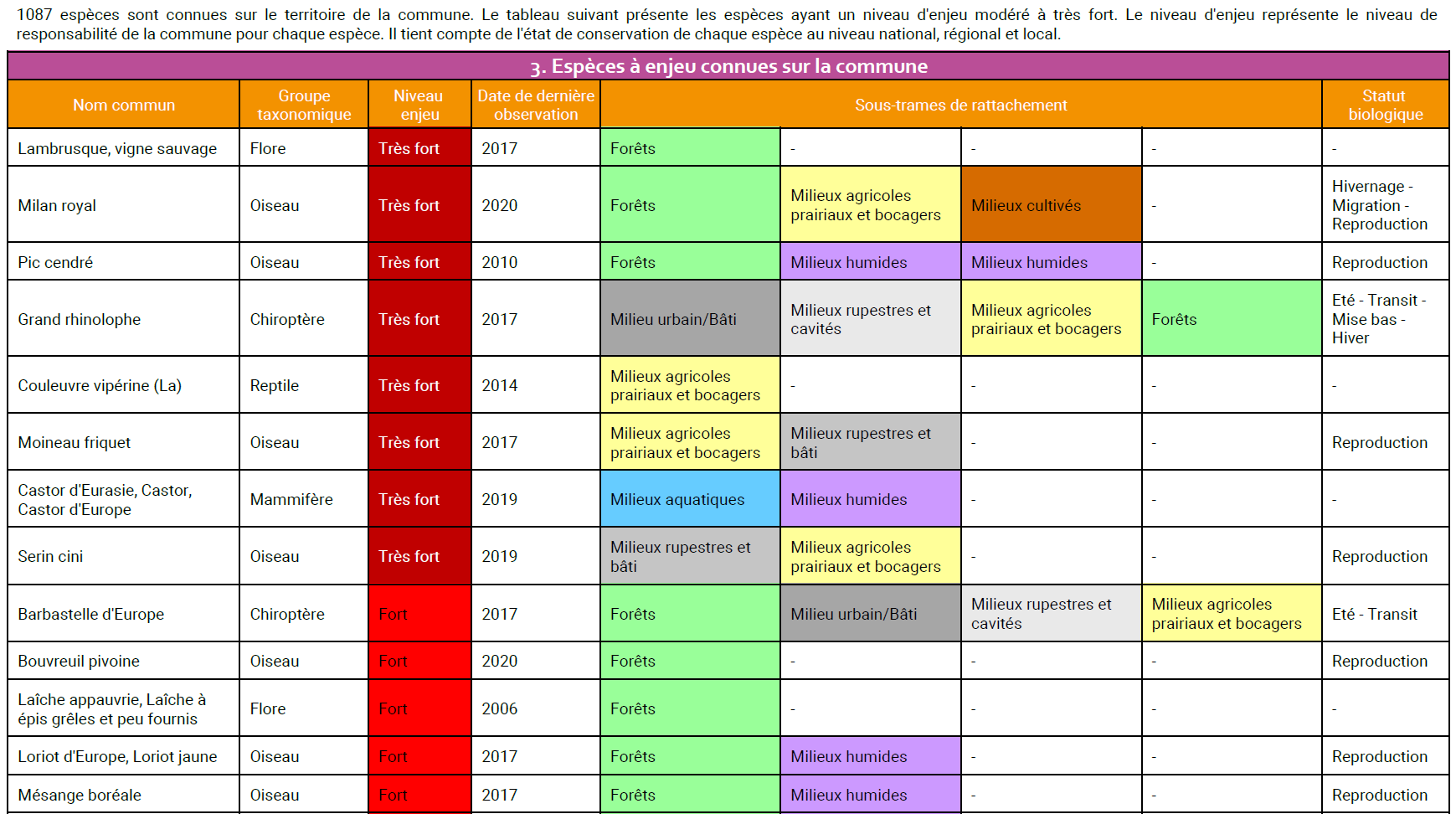 - Espèces à enjeux connues sur la commune : définis à partir de croisement e différents critères (listes rouges, responsabilité régionale...)